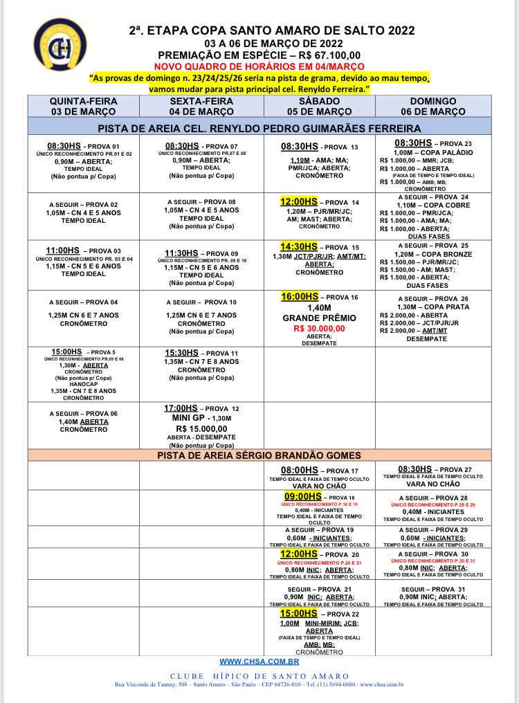 3 a 6/3 | Ordens de Entrada, Resultados, Horários e Inscrições 2ª Etapa Copa Santo Amaro – Premiação: R$ 67,1 mil