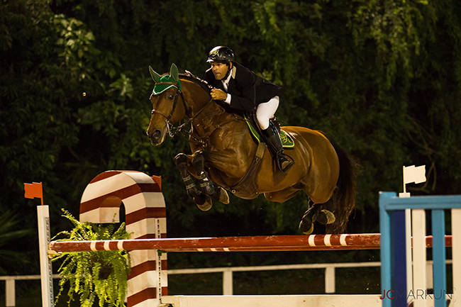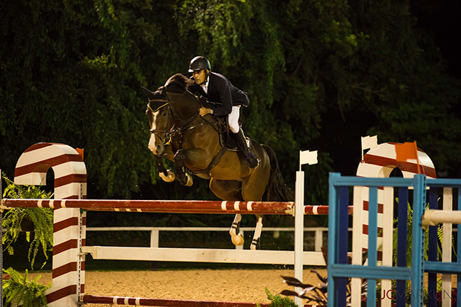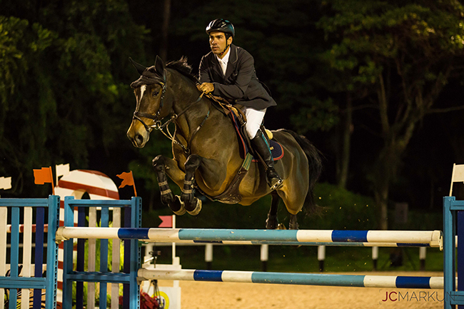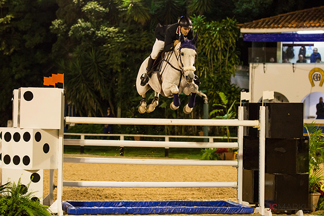 No começo da noite do sábado, 29/4, não teve para ninguém no GP do Concurso de Salto Nacional D ´Maio no Clube Hípico de Santo Amaro. Bruno Pessanha montando a craque Transwaal Alouette van het Lambroek, uma filha de Baloubet du Rouet de nada menos que 18 anos, dupla que também venceu a prova a 1.40 na sexta-feira, 28/4, foi o grande campeão. Dos 40 conjuntos, dos 12 melhores dos quais 9 sem faltas habilitaram-se à 2ª e decisão volta, a 1.45 metro, com armação do course-designer internacional Vailton Jaci Cordeiro. Bruno e Transwaal Alouette foram o último conjunto em pista e com mais um percurso sem faltas em 45s75 garantiram a vitória.
