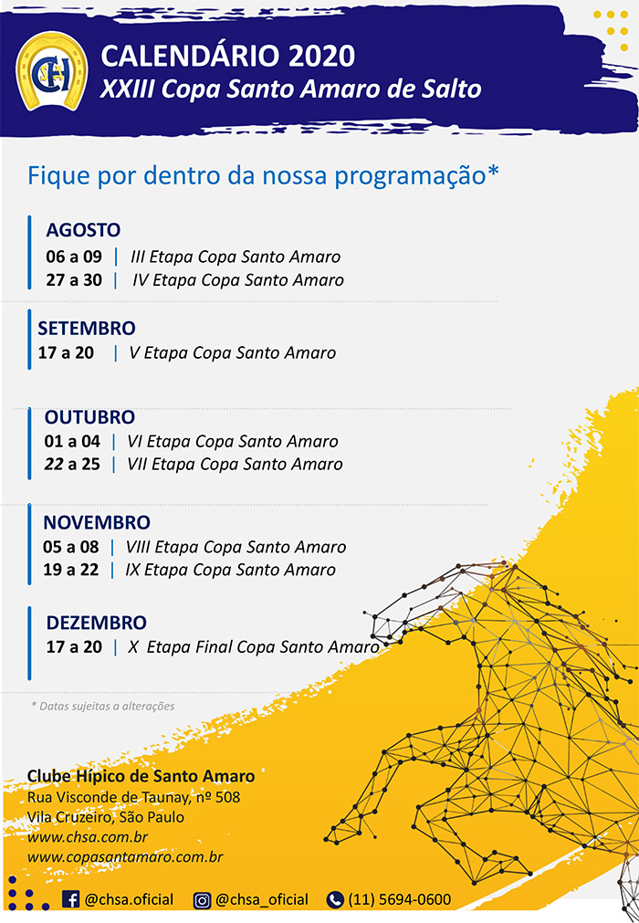 Com satisfação, divulgamos o Calendário da Copa Santo Amaro de Salto do 2º semestre de 2020, retomando as atividades esportivas após o período da quarentena. Em breve no calendário geral.