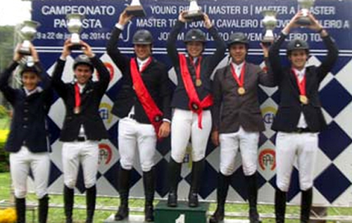 Após três dias de competição o Campeonato Paulista da categoria Young Riders, a jovem amazona do CHSA Daniela Aquino de Arruda Martins com Zarisma conquistou o título do campeonato em uma prova com grandes disputas no percurso com obstáculos a 1,45m, montado na pista de grama do CHSA. Dos 11 conjuntos que largaram na disputa, dez se apresentaram no domingo, 22 de junho, em dois percursos distintos desenhados por Carlos Alberto Raposo Lopes. Sem nenhuma penalidade após cinco percursos, Daniela subiu no topo do pódio seguida por Thiago Aquino de Arruda Martins, montando Anneline, com 8,48 pontos perdidos. Pelas cores da Sociedade Hípica Paulista, Luis Antonio Piva Filho e Cavalleria Toscana Zaterdag Cooper conquistaram a medalha de bronze com 11 pontos perdidos. O quarto melhor resultado foi do cavaleiro Filippo Ferrantelli, com Corlanda JMen, ao computar 18,76 pontos. Vitor Dantas Medeiros e Mario João Boff Neto, ambos da Sociedade Hipica Paulista, com 21,48 e 25,91 completaram o placar do campeonato. Nas fotos, Daniela e Thiago, primeiro e segundo lugares da categoria, e fódio final do estadual de Young Riders Fonte e foto: Roberta Milani