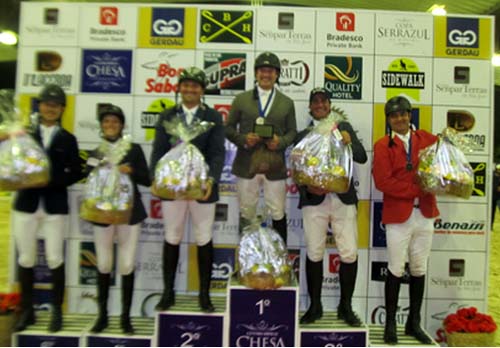 O Centro Hípico de Excelência Serra Azul realizou no sábado, 7 de junho, o Mini Grande Prêmio da I Etapa do Circuito Indoor Serra Azul, e o cavaleiro do CHSA José Roberto Reynoso Fernandez Filho representou o CHSA na terceira colocação do pódio. Gabriel Malfatti, desenhador do evento, preparou um percurso bastante técnico com o tempo concedido de 74 segundos. Dos 54 conjuntos que largaram, 11 superaram sem faltas o percurso e habilitaram-se ao desempate. A vitória ficou com o catarinense João Vitor Marcon, com Cantonius JMen, sem faltas, na imbatível marca de 28s70. Pelas cores do Paraná, Daniel Cesar Maranhão Khury, montando Quite Capitano, foi o segundo colocado, com zero em 30s46, seguido por José Roberto Reynoso Fernandez Filho, com EZP Eros De Kalvarie, na marca de 33s98. Sem faltas em 34s08, Daniela Lemos Castro e Calida chegaram em quarto lugar, enquanto Denis Gouvea e Rodrigo Tsau completaram o placar na quinta e sexta colocações respectivamente. Fonte e foto: Por Fora das Pistas