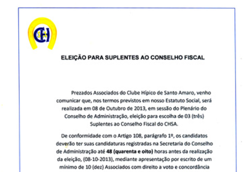 O Presidente do Conselho de Administração, Sr. Luis Duílio de Oliveira Martins, informa aos associados que, nos termos previstos no Estatuto Social do CHSA, será realizada em 8 de outubro de 2013, em sessão do Plenário do Conselho de Administração, eleição para a escolha de três (3) Suplentes ao Conselho Fiscal do CHSA. De conformidade com o Artigo 108, parágrafo 1º, os candidatos deverão ter suas candidaturas registradas na Secretaria do Conselho de Administração até 48 horas antes da realização da eleição, no dia 8 de outubro, mediante apresentação por escrito de um mínimo de 10 (dez) associados com direito a voto e concordância expressa dos candidatos quanto a própria candidatura. Somente poderão integrar o Conselho Fiscal os associados com pelo menos 3 (três) anos de associado proprietário do CHSA, maiores de 18 anos e quites com os cofres sociais. [gview file=”http://www.chsa.com.br/wp-content/uploads/2013/09/Elei+º+úo-suplentes-CF0001.pdf”]