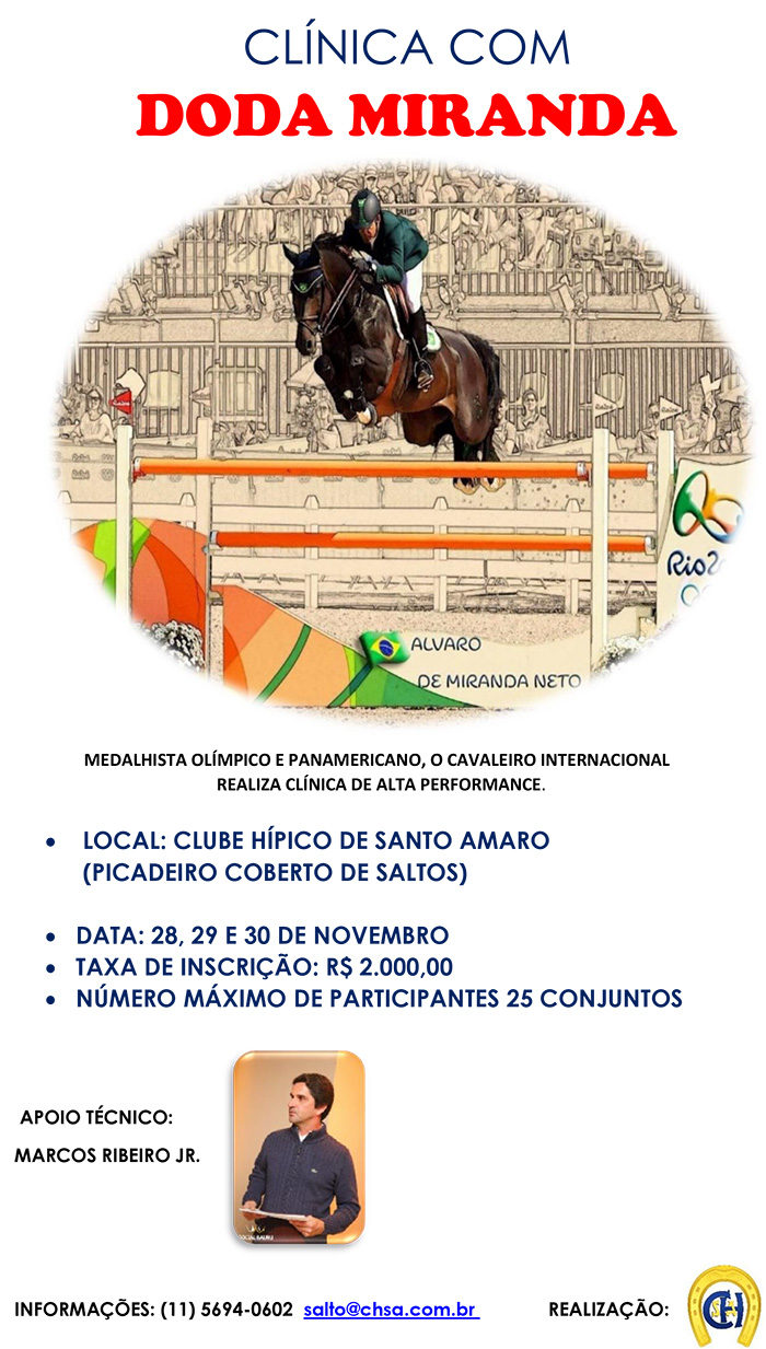 De 28 a 30/11 tem clínica com Doda Miranda no CHSA