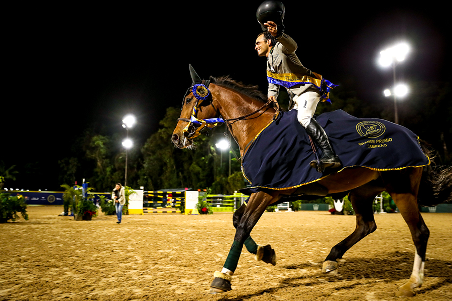 Stephan Barcha e Chevaux Primavera Montana Império Egípcio no hall dos campeões do GP do Clube Hípico de Santo Amaro